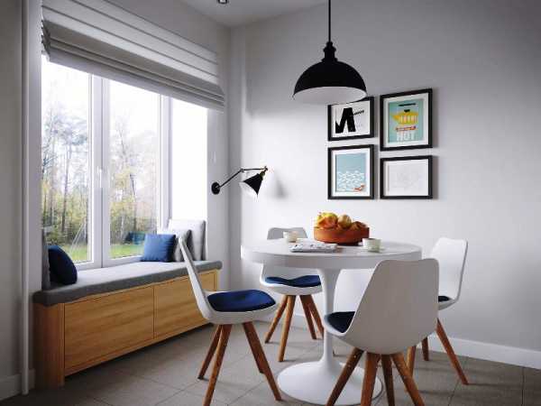 - возле окна устроилась обеденная зона, состоящая из круглого стола и четырех дизайнерских стульев вокруг него;