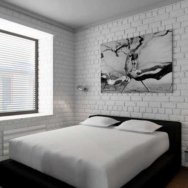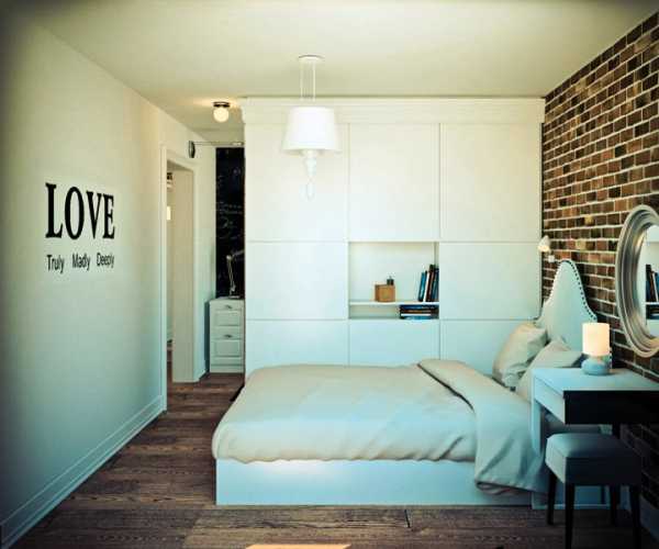 Удачное расположение дверных проемов позволило выделить в комнате место для отдельной гардеробной. Перегородку выложили белым декоративным кирпичом, как и часть расположенной рядом стены – кирпич в дизайне выделил место для отдыха с креслом и декоративным камином.