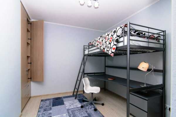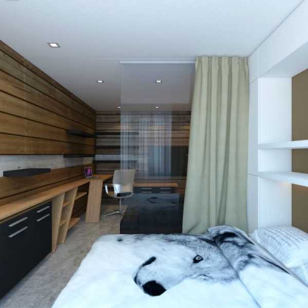 В детской части поместили кровать-чердак, под которой расположилось место для занятий школьника. «Взрослая часть» служит в дневное время гостиной, в ночное диван превращается в двуспальное ложе.