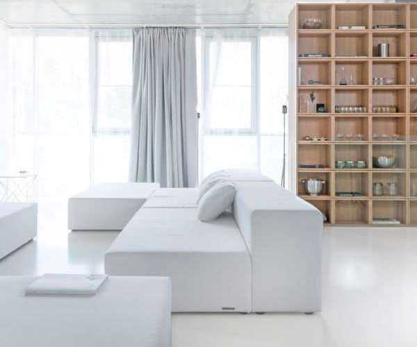 Система хранения от потолка до пола разделила спальню и гостиную. Со стороны гостиной в системе хранения имеется ниша для телевизора, а также полки для хранения вещей. Возле стены напротив расположена конструкция из выдвижных ящиков, в центре которой диванные подушки образуют уютное место для отдыха.