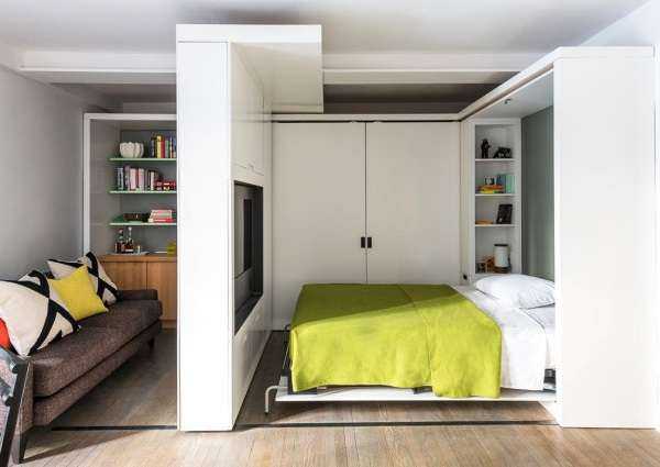 Чтобы разделить интерьер однокомнатной квартиры на функциональные зоны, необязательно использовать стены или гипсокартонные перегородки. Вышеупомянутая мебель-трансформер позволит гостиной одновременно выступать в роли спальни.