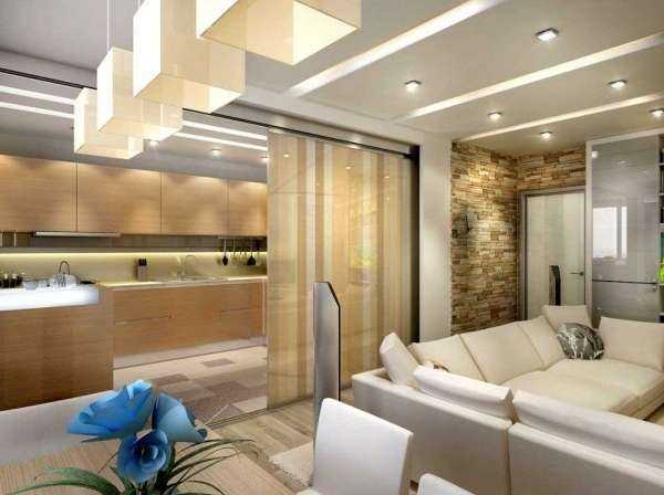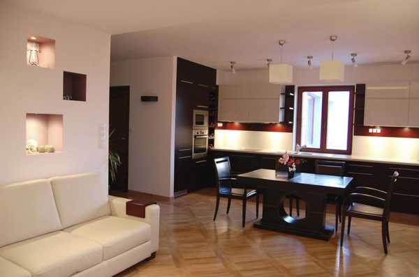 Самым распространенным и легким вариантом увеличения физического пространства является ликвидация стен-перегородок между основным помещением и вспомогательными. Чаще всего убирается перегородка между залом (если угодно, гостиной) и кухней. Объединение с кухней – не лучший вариант, потому что кухня должна быть отделена от общего пространства квартиры. Не все запахи кухни ласкают обоняние. Но ваше желание находиться в свободном пространстве отодвигает на второй план этот негатив. В конце концов, из кухни доносятся чаще «вкусные» запахи.