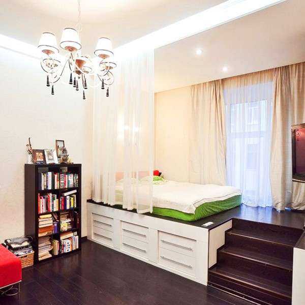 Спальню поместили в нишу, соорудив подиум – его можно использовать для хранения вещей.