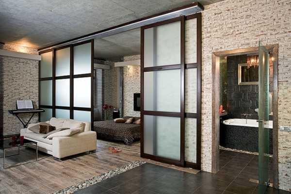 Визуально увеличить пространство можно за счет установки прозрачных, стеклянных дверей, ведущих во вспомогательные помещения. Правда, такие двери должны иметь жалюзи, позволяющие закрыть это пространство в нужный момент.