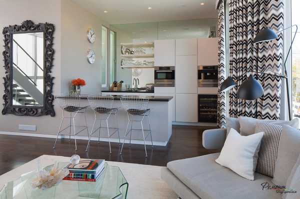 Кухня может быть совмещена с гостиной, но при этом отделяться от нее барной стойкой, которая в то же время может выступать в роли обеденной зоны и «острова».
