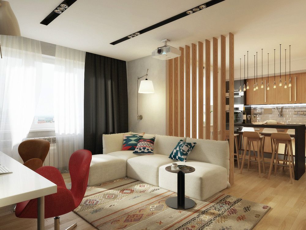 Чтобы добавить интересный элемент дизайна, рассмотрите возможность использования чего-то другого, кроме ткани. Складные ширмы, подвесные деревянные бусы или даже несколько оконных стекол не только служат разделителями пространства в микроквартире, но и придают пространству желаемый стиль.