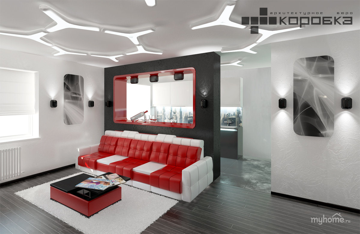 Естественно, речь не идет о занавесках в цветочек, но выбрать другой оттенок или более насыщенный цвет можно. К примеру, классическое сочетание черный-белый-красный выглядит вполне себе футуристично и свежо. Сиреневый, фиолетовый и голубой тоже способны здорово освежить интерьер гостиной. Но не увлекайтесь — цвет желательно добавить лишь один и, по возможности, более холодной гаммы.