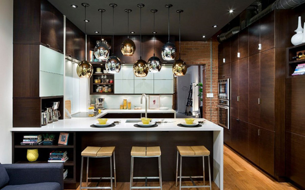 современный индустриальный дизайн кухни со светильниками от ИКЕА