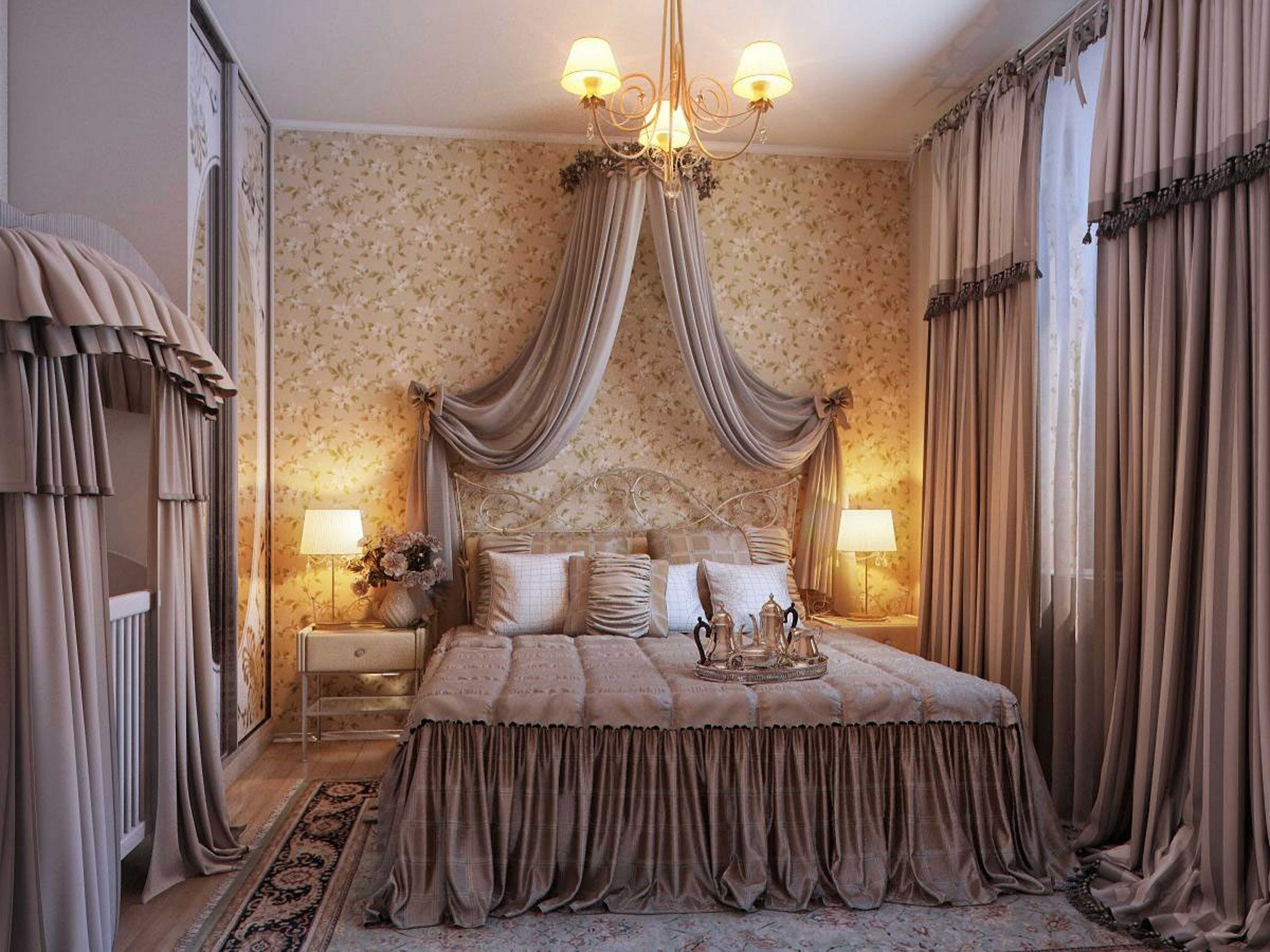 Оригинальная штора для классической спальни. Модель смотрится необычно благодаря асимметричному дизайну, подобранной ткани, креплению шторы. Золотистая ткань с «мраморным» принтом, собрана в складки. Модель крепиться к классическому карнизу с помощью лент.