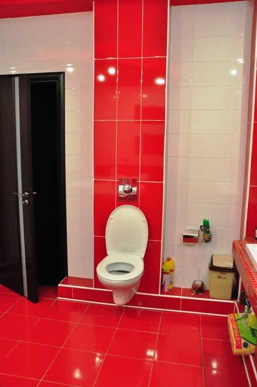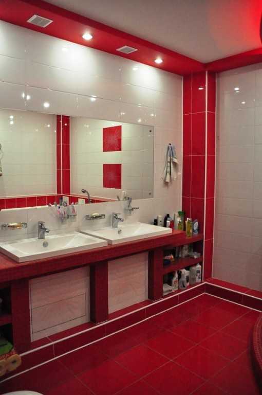- Красный кафель — незаменим в стилях арт-деко, хай-тек, восточный. Грамотное сочетание размеров плитки с декором и аксессуарами под силу лишь опытному дизайнеру.