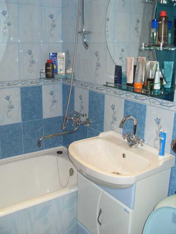 Часто в домах-хрущевках санузел совмещен (ванная объединена с туалетом). Пространство при этом ограничивается 3м². В соответствии с такими характеристиками вертикальные и горизонтальные поверхности в ванной лучше отделать в светлых оттенках. Плитка выбирается среднего размера. Высота потолков увеличивается следующим приемом: комбинируются цвета верхней и нижней части стены. Вертикальные поверхности разделяются на 2 зоны. Внизу плитка должна быть более темной.