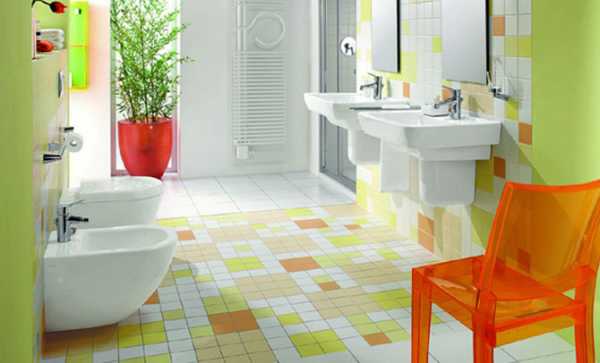 В современных дизайнерских решениях часто применяется сочетание плиток разного размера и цветового оформления. Очень модным считается использование альянсов алого с зеленым, фиолетового с желтоватым, голубого с оранжевым.