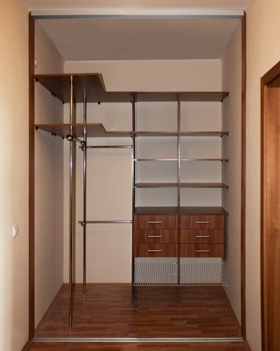Маленькая кладовка гораздо вместительнее любых шкафов, поэтому в ней можно хранить одежду и обувь. В этом случае кладовка превращается в отличную гардеробную. Лучшей идеей будут две трубы, на которых располагаются вешалки для одежды. Для головных уборов вешается специальная полка. Для постельного белья — стеллажи. Двери гардеробной удобно сделать раздвижными, с зеркальными панелями. Иногда двери хорошо заменяются плотной ширмой. Текстиль такой занавеси подбирается в соответствии со стилем интерьера.