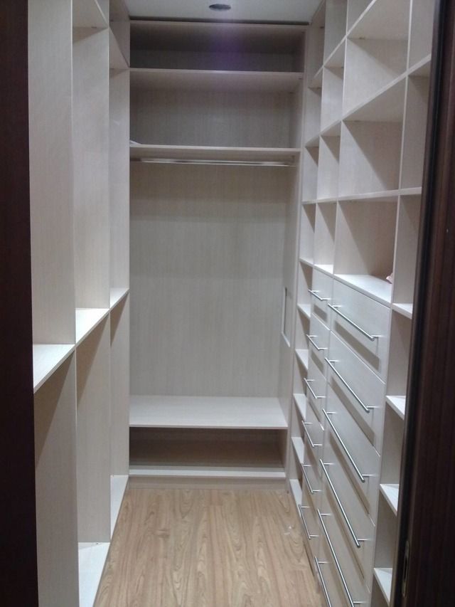 Помещение гардеробной является одним из наиболее популярных видов переобустройства кладовой малогабаритной квартиры. Одежда и белье хранятся на полках, штангах с вешалками, на крючках или в выдвижных ящиках, корзинах или контейнерах. На полу обычно стоит обувница или есть полки со скошенными поверхностями для хранения туфель, ботинок и других пар.