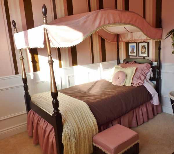Отделку стен лучше сделать в теплых тонах без рисунка, чтобы не создавать избыток цвета и узора. Главный акцент – это кровать с балдахином, которую обожают все дети.