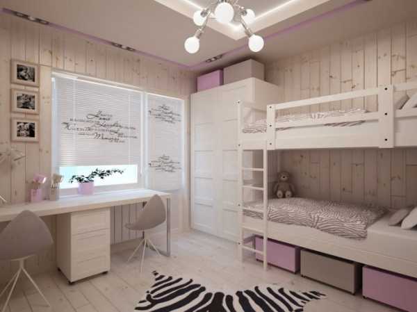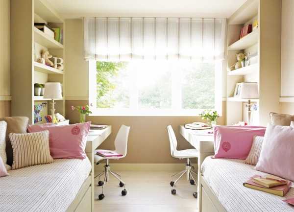 Если площадь комнаты невелика, спальное место для двух девочек в любом случае станет двухъярусным. Производители мебели предлагают весьма интересные и красивые конструкции, поэтому особых возражений со стороны подростков по поводу такого решения обычно не возникает. Если оба ребенка школьники, каждой потребуется выделить и обустроить рабочую зону, где будет комфортно заниматься уроками. Далеко не всегда можно поставить в небольшой комнате сразу два рабочих стола, даже если те не отличаются своими габаритами. Выходом может стать установка одного стола, а вместо второго использовать соответствующим образом доработанный подоконник.