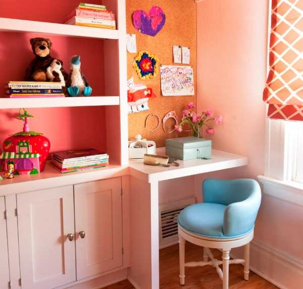 Рабочее место должно быть хорошо освещено. Стол желательно расположить у окна, чтобы на него как можно дольше в течение дня падал дневной свет. Стол должен быть функциональным, со стеллажами, выдвижными ящиками, чтобы все необходимое для учебы и творчества было под рукой. В комнате для девочки подростка обязательно должен быть удобный стул или компьютерное кресло.