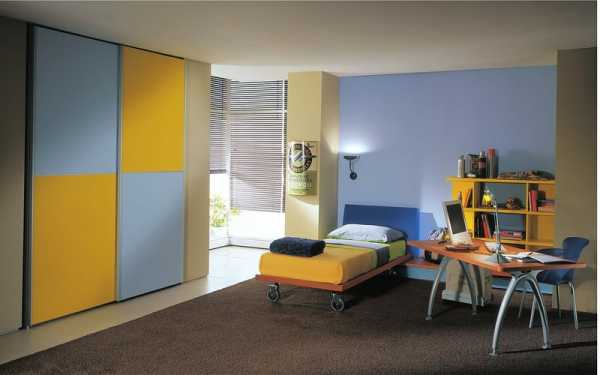 - В качестве мест для хранения вещей идеален будет шкаф-купе. Он вместительный, подойдет и для двух детей. Если вы оформляете комнату для подростка мальчика, то не нужно ставить большой шкаф — наши мужчины обычно не слишком привередливы в одежде. Идеально, если вам удастся организовать встроенный в стены шкаф — и удобно, и экономится пространство.