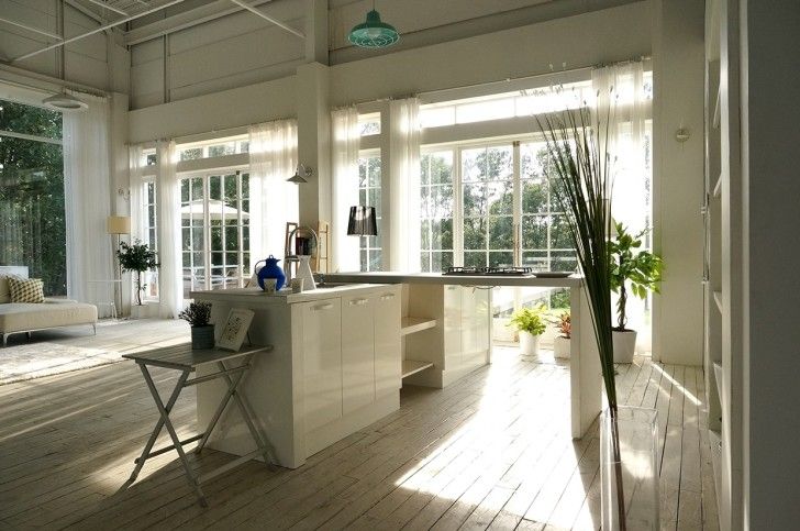 Вот другой ракурс этой же кухни. Светлое дерево, белые фасады кухонной мебели, досчатый пол.