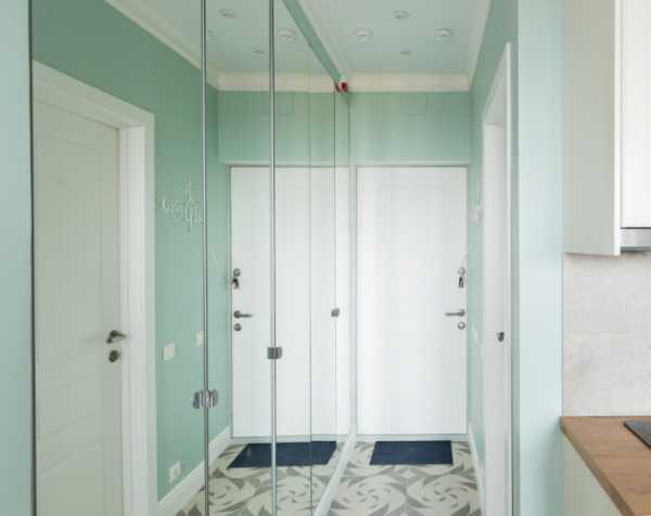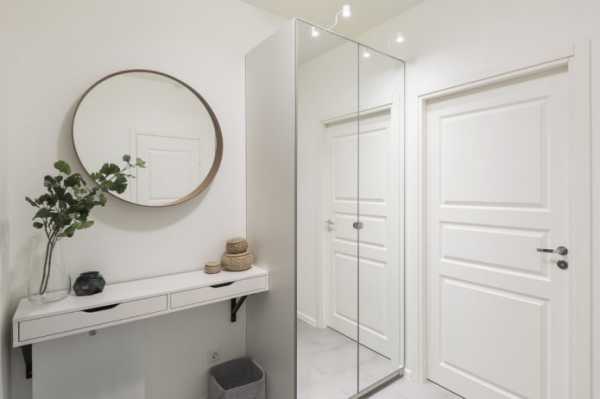 - В небольшой по площади прихожей неплохо бы поместить шкаф с зеркальными фасадами, это поможет визуально сделать помещение более просторным и наполнит его дополнительным светом, отражающимся от зеркальной поверхности.