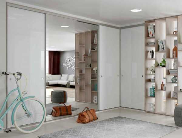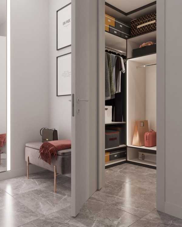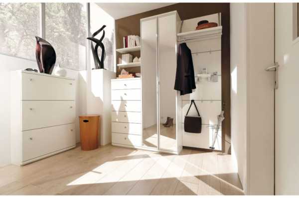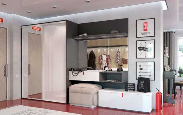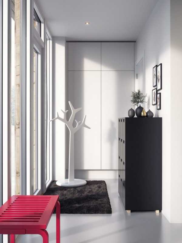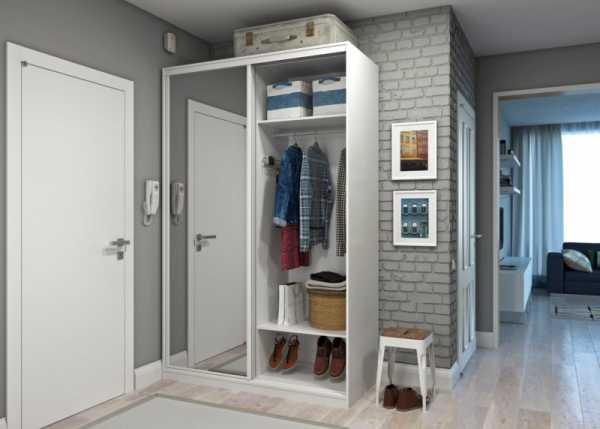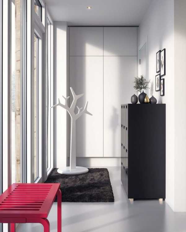Если позволяет размер помещения, прекрасным вариантом станет встроенный шкаф-купе. Там вы сможете размещать одежду, аксессуары и другие вещи. Популярностью пользуются и комплексы с открытыми вешалками для верхней одежды, небольшими шкафчиками и тумбами.