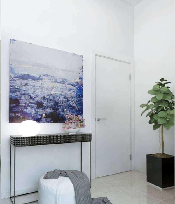 - Минимализм. Для этого стиля характерны строгость и лаконичность. Однотонные стены, встроенные светильники или потолочные люстры скромного дизайна, отсутствие лишних деталей – вот отличительные характеристики такой прихожей. Для украшения могут быть использованы черно-белые фото в рамах, авангардные картины. Цветовая гамма обычно холодная. Это белый, светло-серый, бледно-голубой, контрастные элементы черного и коричневого.
