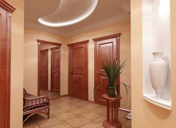 Двухуровневые конструкции потолка из гипсокартона могут украсить лишь просторную прихожую. Для небольшого коридора лучше выбрать вариант идеально ровного натяжного потолка.