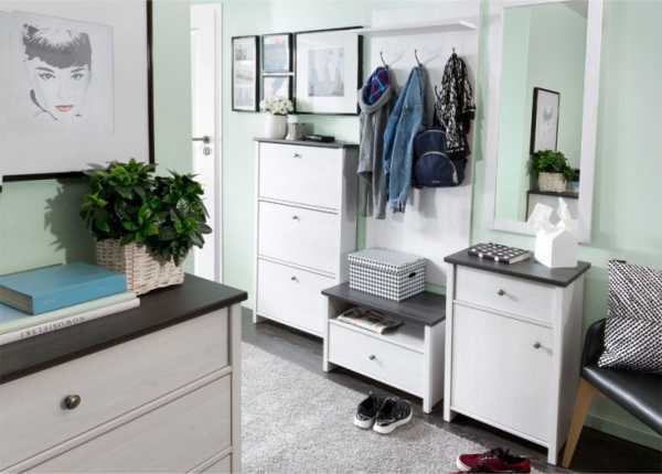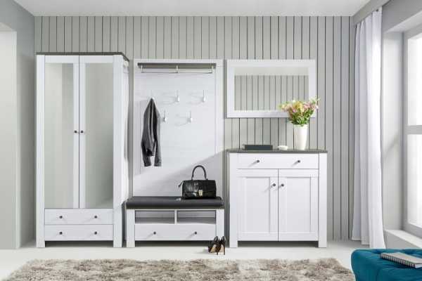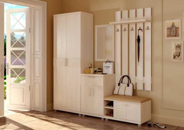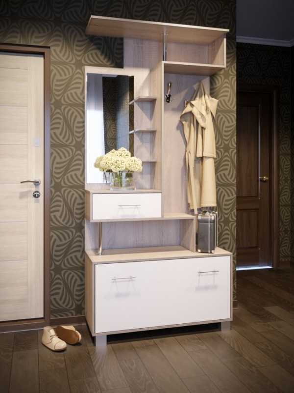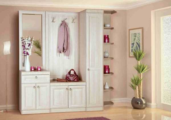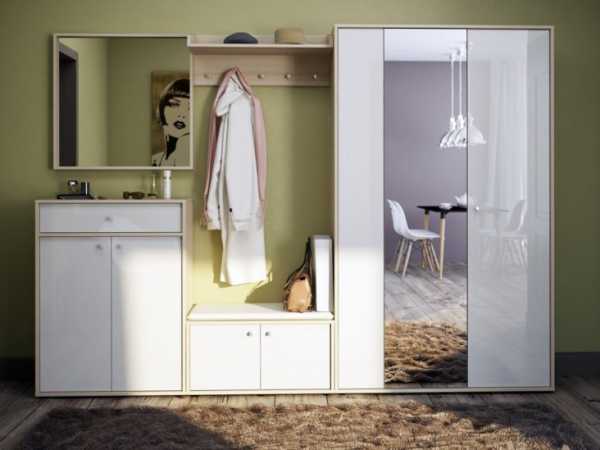 Обычно это комплект из одностворчатого шкафа, зеркала, которое поможет осветлить и расширить пространство, вешалки для одежды и двух тумб. Он поможет не только украсить пространство, но и сэкономить его.