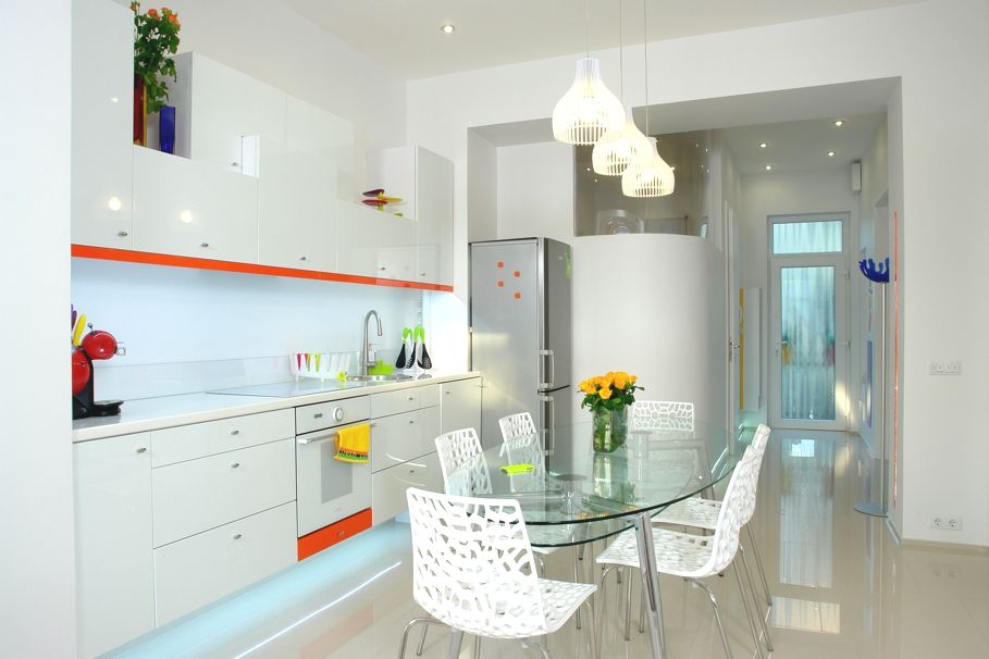 Я считаю, что интерьер квартиры только выиграет, если мойка будет расположена через 40-60 см от холодильника. Можно быстро вымыть овощи, которые вы достанете из холодильника. Ту же самую колбасу можно запросто положить на столешницу между холодильником и мойкой. Как видите, все более, чем удобно.