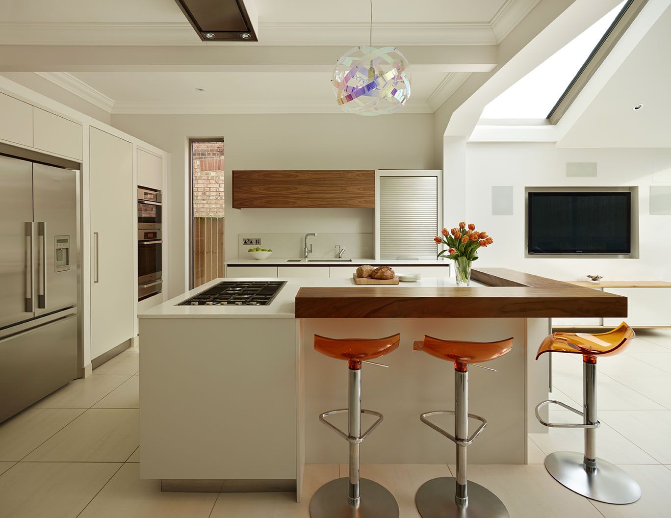 Дизайн кухни создавался круглосуточно.Владельцы первыми приобрели часы и хотели, чтобы они были украшением, поэтому остров из нержавеющей стали от Bulthaup был специально расположен, чтобы выделить его.