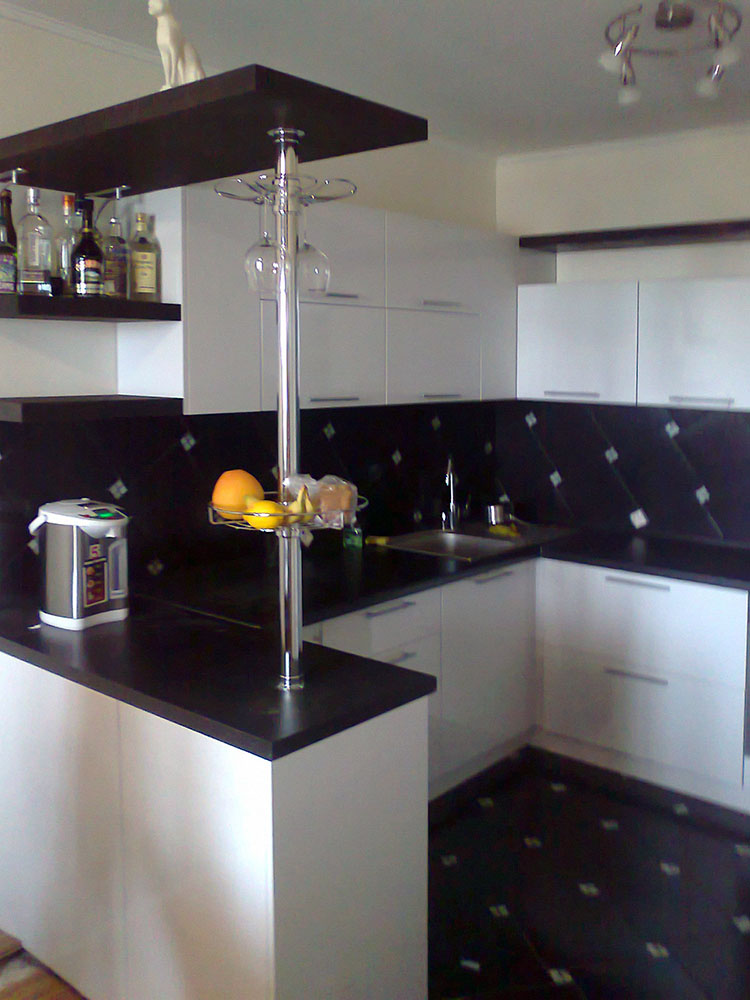 Это идеальный вариант для маленькой кухни. Угловая конструкция, как продолжение гарнитура не только универсальна, но и функциональна: высокие барные стулья поместятся под столешницей, она является дополнительной площадкой хранения кухонных принадлежностей.