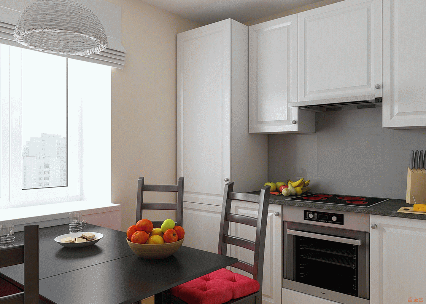 Наличие мелких разноцветных деталей зрительно загромождает пространство и подчеркивает скромные размеры комнаты. Простота и свободные поверхности создают на кухне комфортный уют.