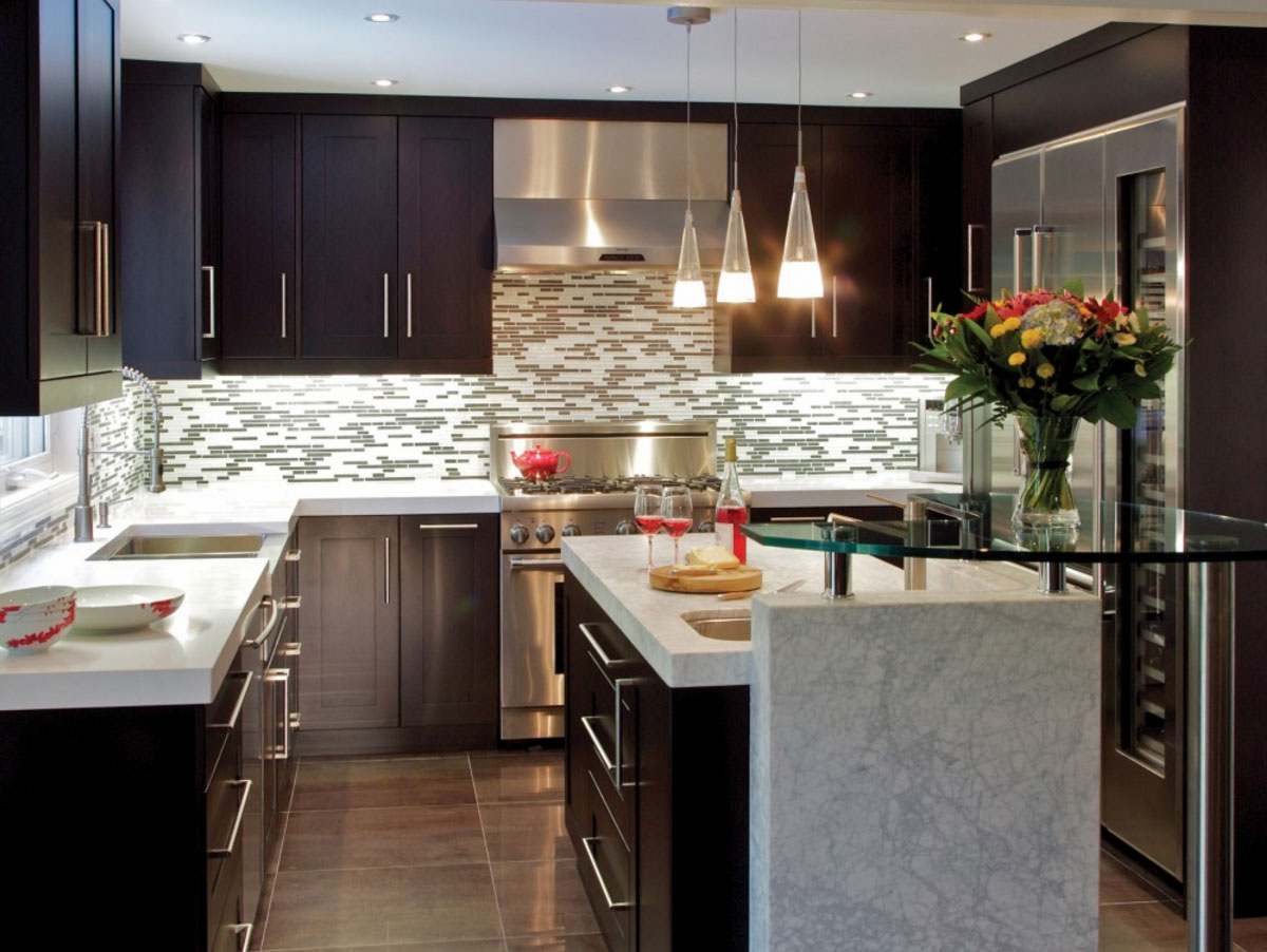 По-настоящему шикарным выбором становится коричневая кухня с выраженной фактурой натуральной древесины. Для классического стиля предпочитают ореховые, шоколадные тона или глубокий оттенок черного кофе.