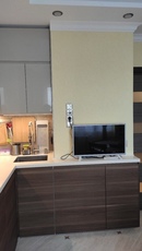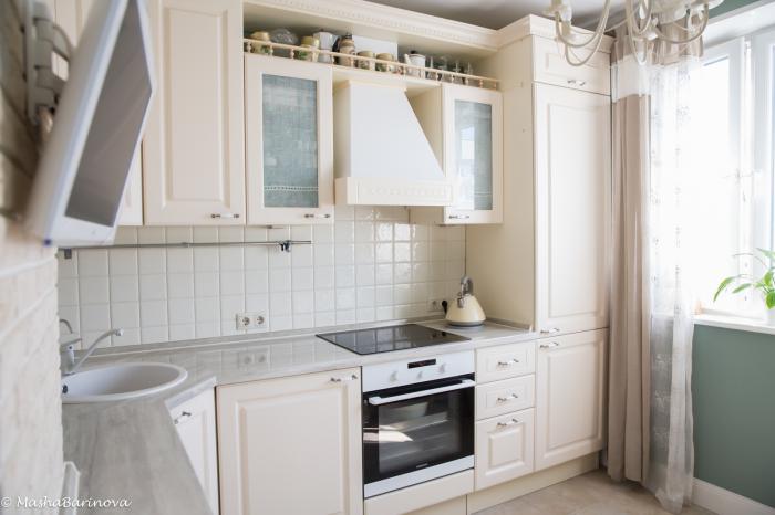к. на некоторых вещах лучше не экономить. Выбор пал на светлый цвет кухонного интерьера в силу того, что «старый дизайн», если можно так выразиться, был в жёлто-коричневой гамме и, хотелось чего-то реально другого и более свежего. К тому же, вопреки бытующему мнению, светлый цвет менее маркий, на нём менее заметна пыль и грязь что упрощает уход за поверхностями, что для такого помещения немаловажно.