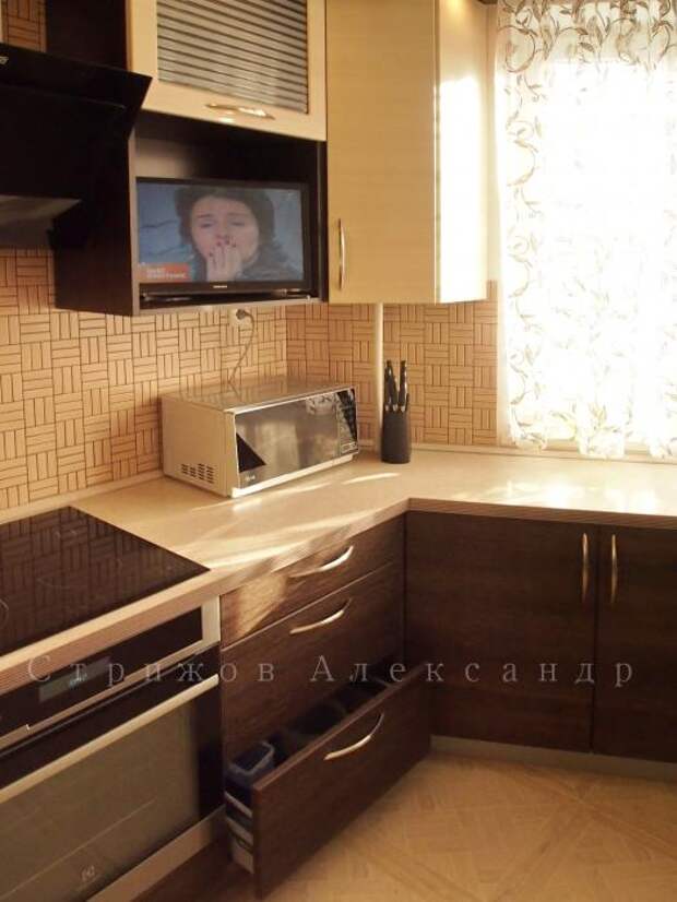 Девушки, как быть с кухней в доме серии П44, кухня с коробом. Как удачно расположить мебель и бытовую технику? Картинка с просторов интернета: