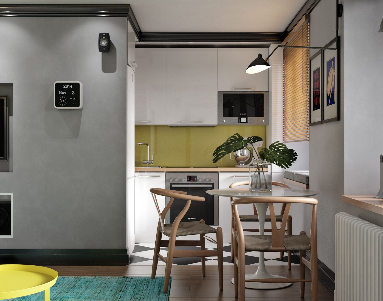 Универсальный вариант — выбрать нейтральную базу и «играть» уже с мебелью и декором. То есть оформить стены светлой краской или обоями в обоих помещениях, на пол уложить ламинат под дерево или паркетную доску, а для зоны кухни выбрать практичный керамогранит — тоже под дерево или базового оттенка. Потолок точно стоит оставить светлым. Натяжная конструкция в условиях слишком низких потолков — спорное решение, потому что она украдет еще несколько драгоценных сантиметров. Поэтому выбор стоит сделать в пользу светлой краски.