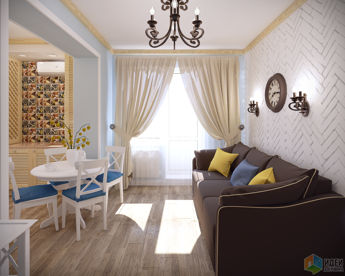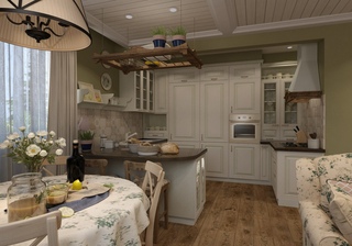 Компактный кухонный гарнитурВы можете оформить кухню-гостиную в стиле прованс, это придаст квартире свежесть и очарование. Главное требование здесь – поиск качественного и красивого обеденного гарнитура. Он должен идеально сочетаться с обоями и кухонными шкафами, а также прочими аксессуарами. Стол в идеале должен быть из натурального дерева, массивный, роскошный.