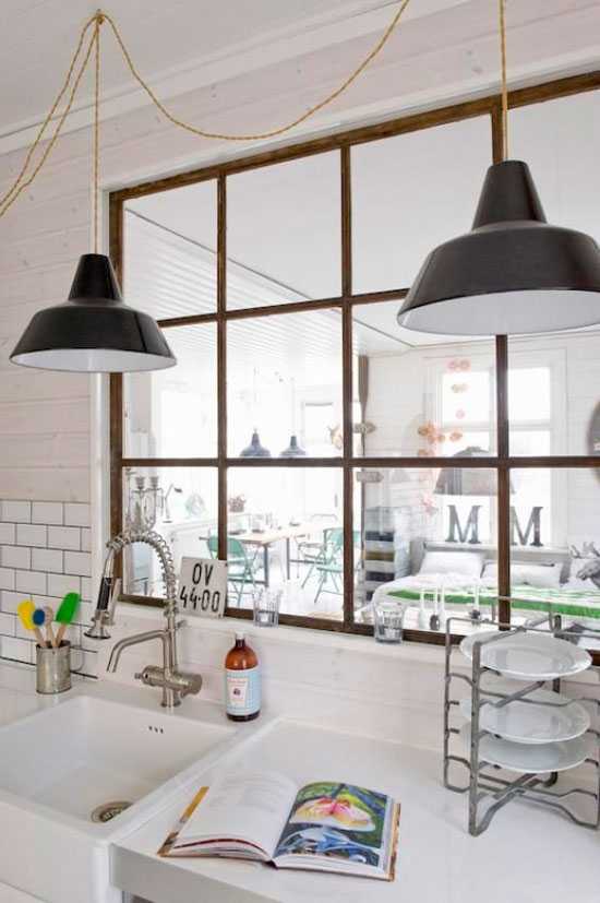 - Межкомнатное окно. С одной стороны, оно позволяет удовлетворить требования СНИПа. С другой — делает кухню уютнее.