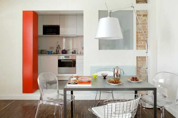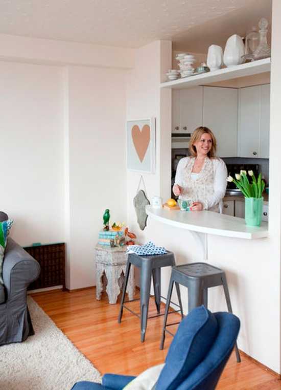 - Раздаточное окно. Возьмите на вооружение ресторанный прием и оформите в смежной стене раздаточное окно. Идея: Превратите его в барную стойку. Это и модно, и практично.