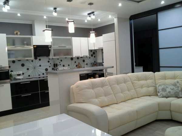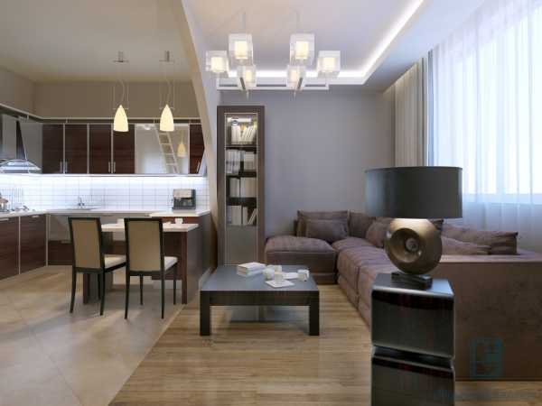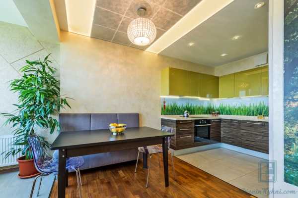 Кухня может быть совмещена с коридором, а также, благодаря сносу стены – с гостиной. В полученном общем пространстве часто кухне выделяется расположение, удаленное от окна. Хотя это место полностью не лишенное естественного света, но до столешницы не поступает достаточное количество света из окон. Поэтому надо очень тщательно спланировать искусственное освещение.