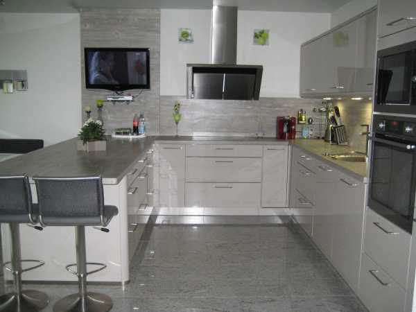 Пространство под всеми стенами использовано под кухонные шкафы. Однако, в тех случаях, когда пространства для хранения довольно много, можно отказаться от части верхних навесных шкафов над столешницей, плитой и раковиной. На стене размещается только вытяжка. В результате, в комнате не ощущается нагромождения шкафов, а стена, окрашенная краской, создает очень современное настроение. Стены, свободные от шкафов, могут быть использованы в качестве украшения кухни. Два высоких встроенных шкафа от пола до потолка возле двери вмещают в себя кухонную технику и предоставляют пространство для хранения кухонной утвари, а, благодаря окраске в светлые тона не выглядят громоздкими.