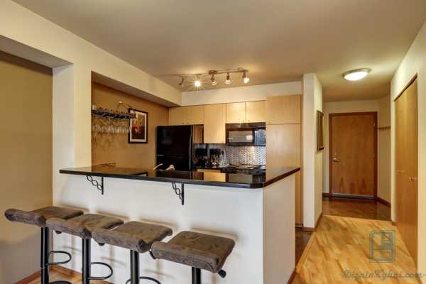 Кухня без окна – дизайн интерьера, фото. Кухня расположена между фойе и комнатой. В центре расположен высокий стол-бар, который отделяет зону столешницы с раковиной и плитой.