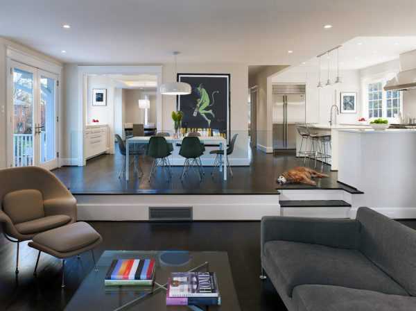 В помещении с высокими потолками отделить зону кухни поможет приподнятый пол. Он помогает скрыть трубы, проходящие через кухню. Достаточно эффектный прием, но увеличение высоты пола большего пространства гостиной приводит к тому, что кухня теряется на общем фоне. Возникает впечатление, что она провалилась под пол.