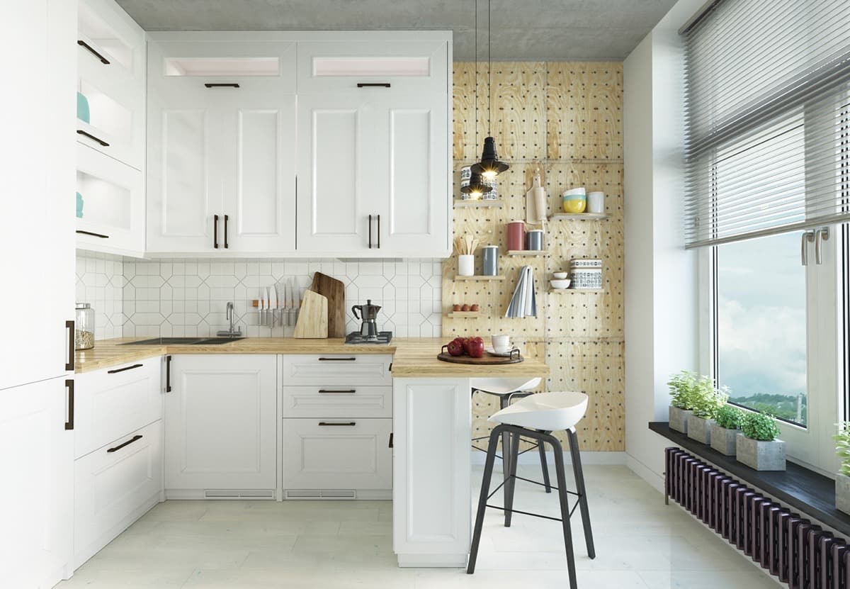 Отличное решение для кухонь, в которых солнце стало слишком частым гостем из-за выходящих на южную сторону окон. По-скандинавски морозный, но при этом очень уютный, этот стиль подойдет для интерьеров любых размеров.