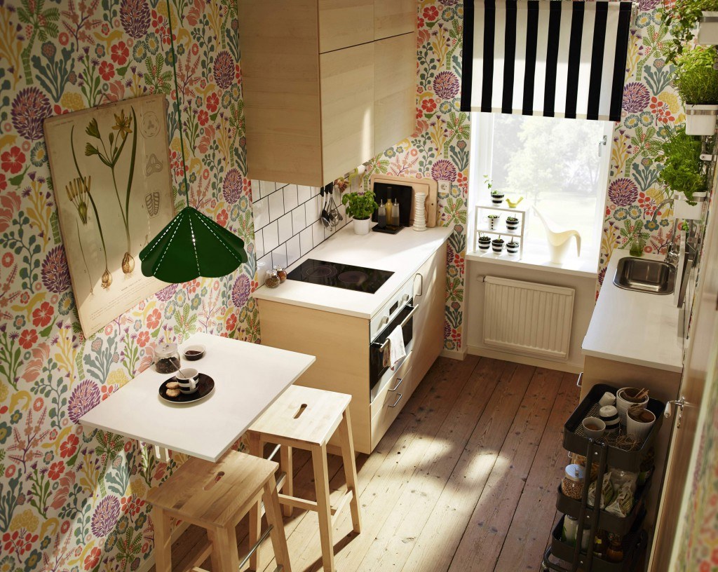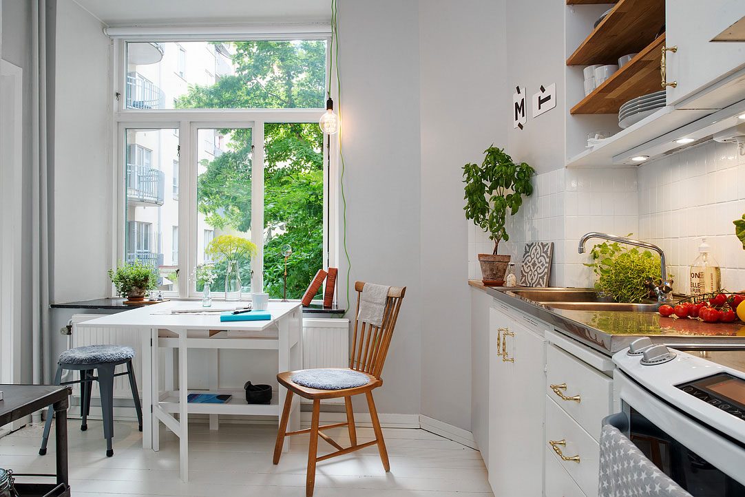 Хорошим решением для экономии пространства в маленькой кухне может стать узкая барная стойка с высокими табуретами, откидные и раскладные конструкции. Роль обеденного стола вполне может выполнять и подоконник, если приподнять его с помощью металлических кронштейнов на желаемую высоту.