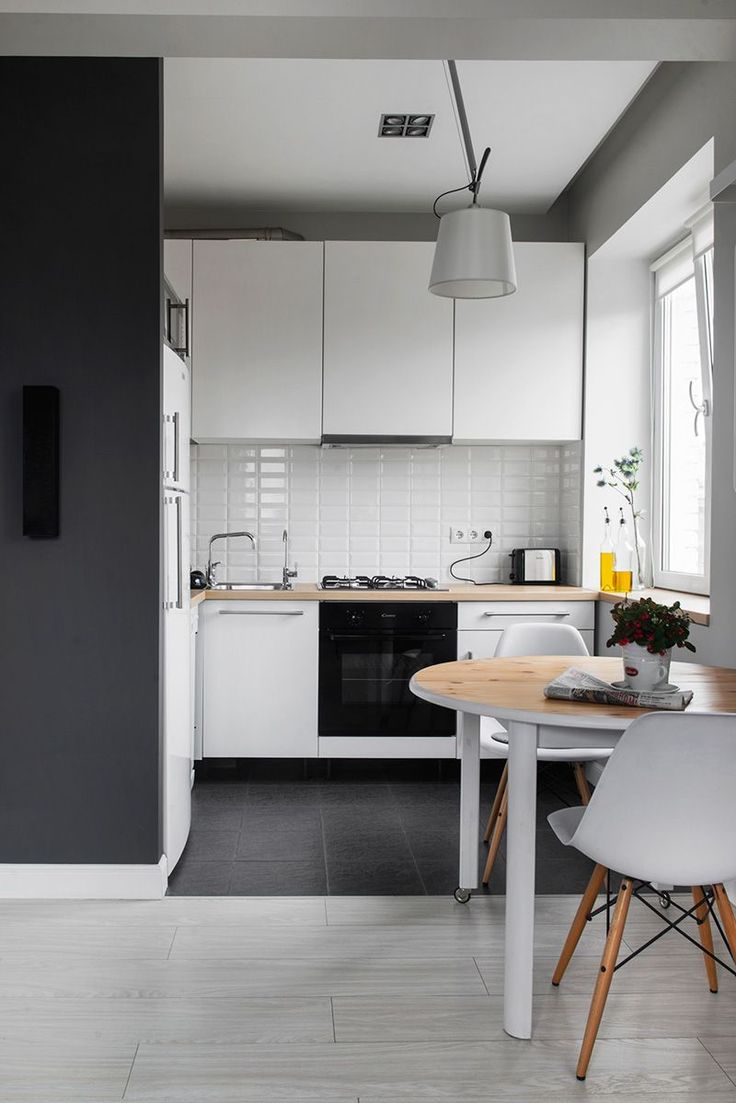Маленькая кухня требует хорошего дизайна. Функциональность — это то, что имеет значение здесь. Хороший способ увеличить интерьер небольшой комнаты для приготовления пищи — соединить ее с гостиной. Дизайн кухни стоит начинать с планировки. В маленькую кухню следует подобрать мебель, которая имеет несколько функций. Полуостров отлично справится с обустройством комнаты. Доказано, что он является отличным решением для небольших площадей. Позволяет максимально использовать поверхность небольшой комнаты, занимая мало места, поэтому вы можете удобно приготовить еду и съесть ее вместе. В свою очередь, пространство под полуостровом будет полезно для хранения кухонных безделушек и монтажа розетки.