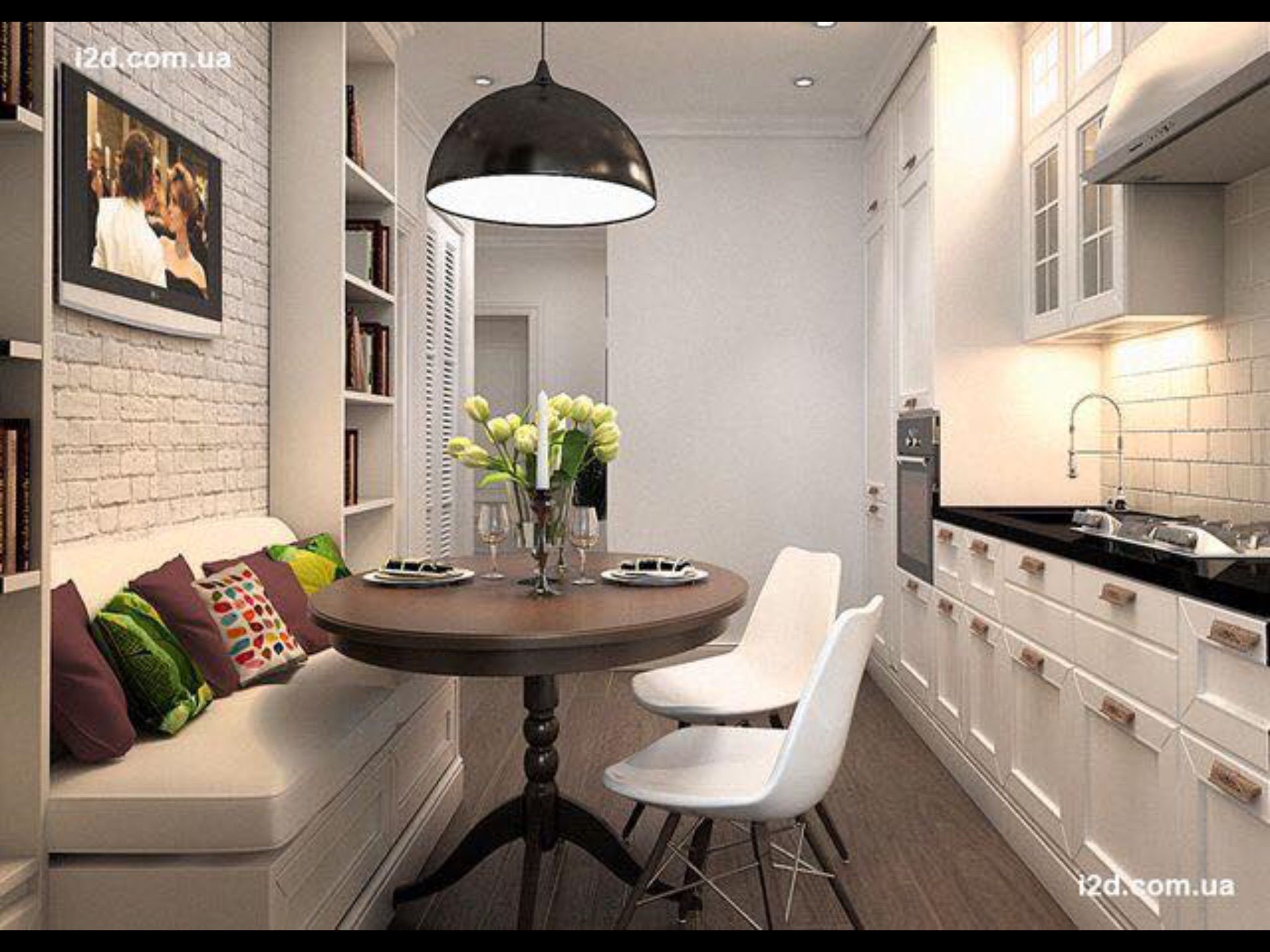 Чтобы изолировать спальное место, необходимо провести объединение комнаты и прихожей, балкона, лоджии или другого помещения. В результате получится неклассическая комната с окном, хоть и небольшого размера. Для визуального расширения пространства используются различные дизайнерские приемы. Кухню можно дополнить столовой зоной при помощи небольшой барной стойки со стульями.