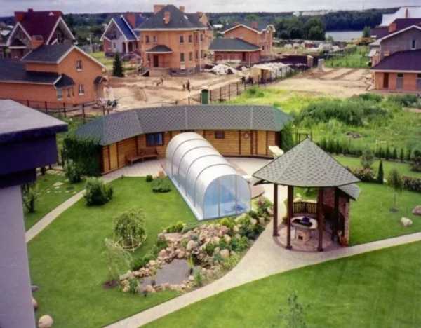 - за домом можно расположить бассейн. Не стоит ограничиваться классическими вариантами – вы можете сделать бассейн любым: и круглым, и треугольным, и даже выполненным в виде сердца.