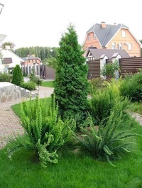 Композиция из разных растений, по мнению дизайнеров, должна строиться на принципе контрастности. Будут изящно смотреться растения в виде пирамиды в соседстве с кустарников в форме шара, высокорослые или низкорослые растения. Дорожки в саду можно декорировать кустарниками с объемом.