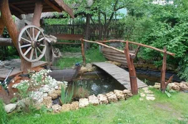 Многие сочетают искусственные прудики с колонкой или деревянным корытом, которые органично сочетаются и входят в ландшафт. И если пруд – это украшение сада, то вот колонкой или кадушкой можно подчеркнуть простоту очарования сельского пейзажа в хозяйственной части.